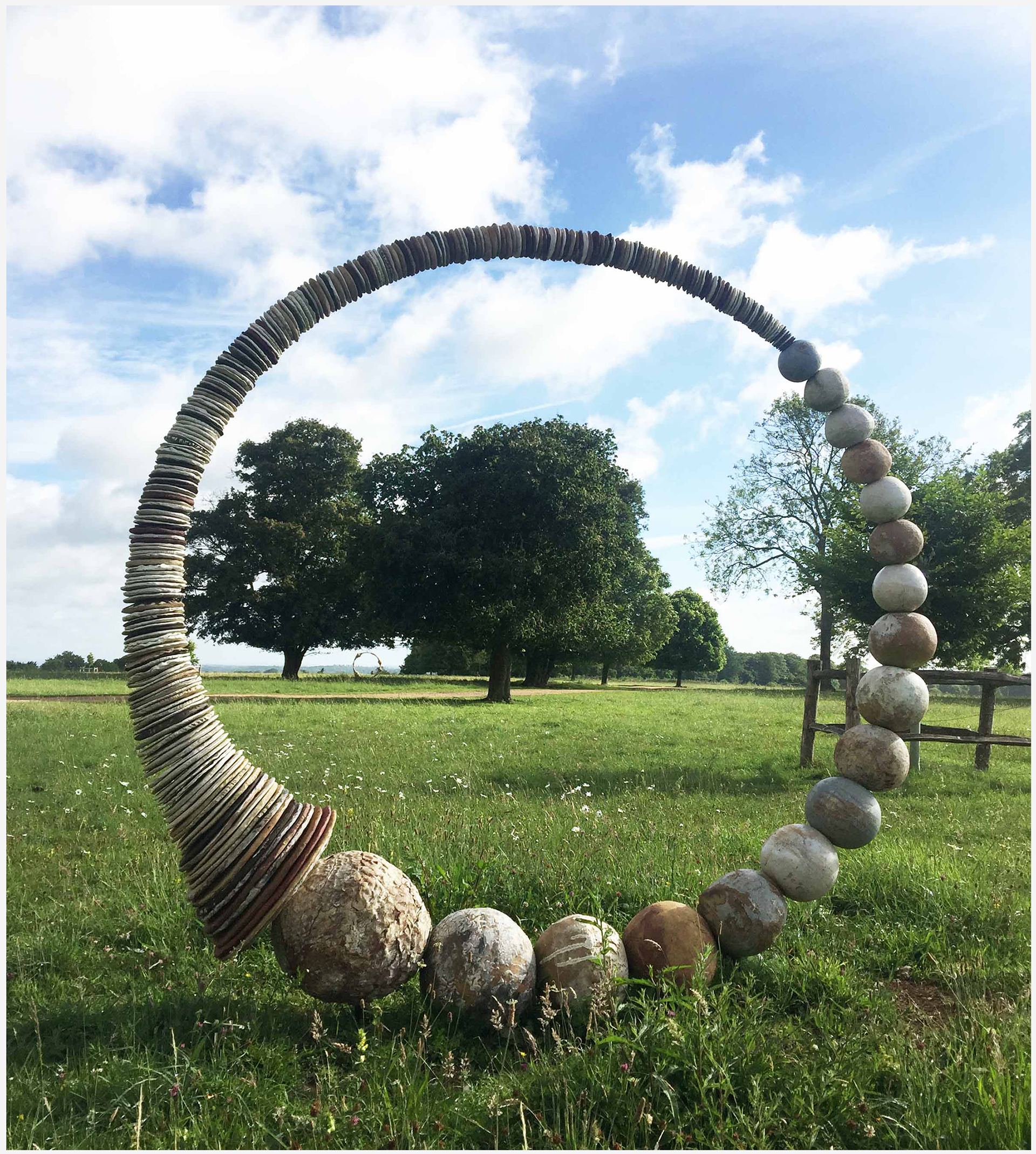 Stoneware and porcelain discs, hand thrown spheres glazed and textured in varying high fired glazes and oxides on a steel armature
