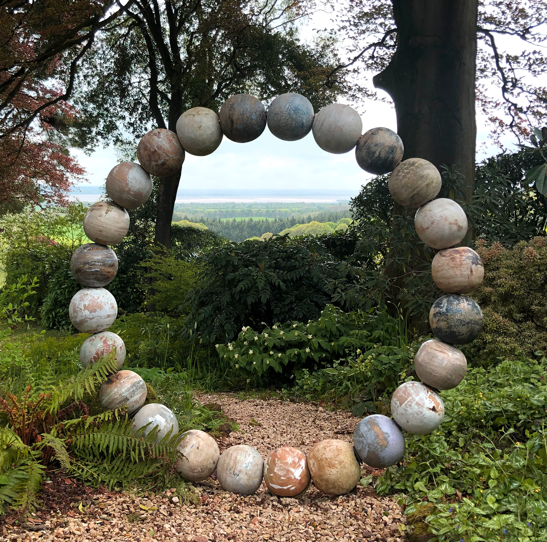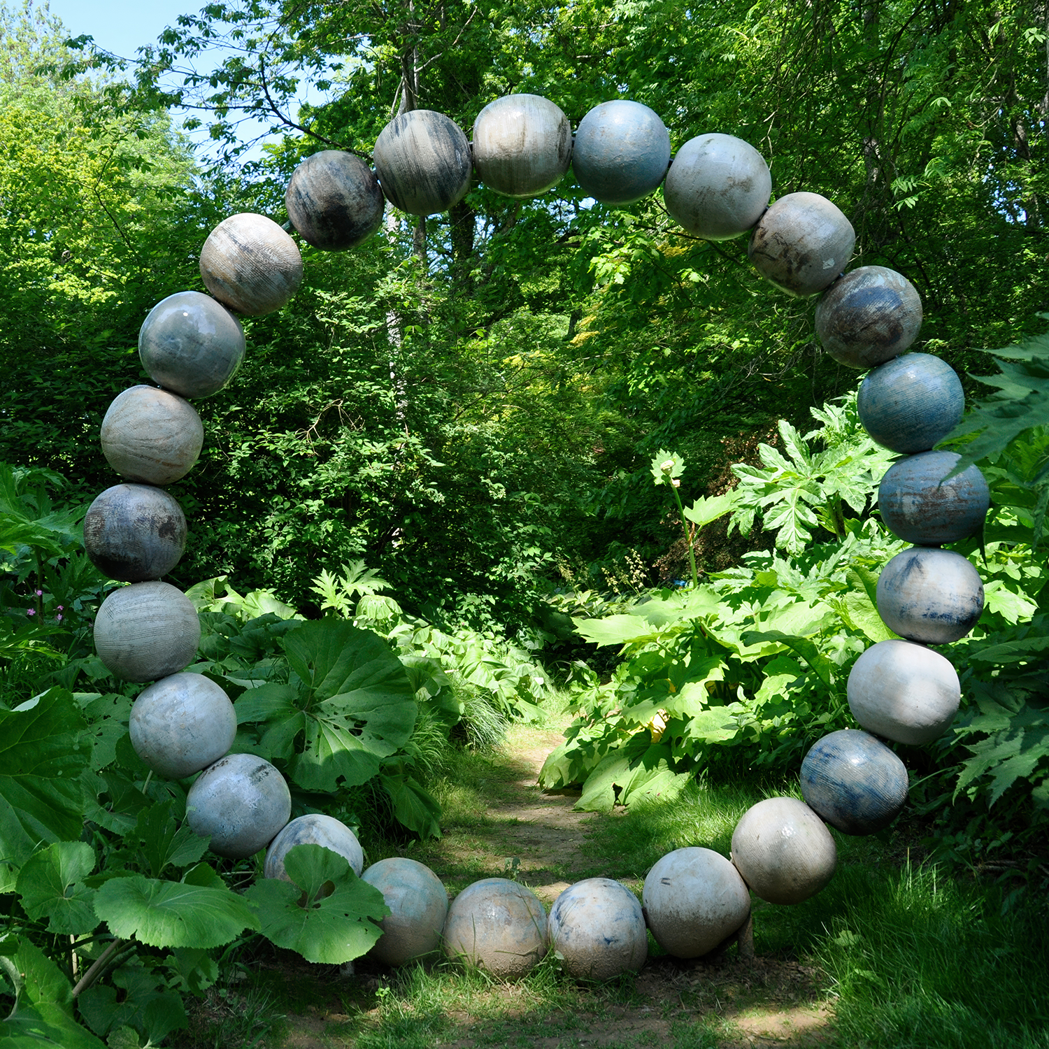 Stoneware glazed and thrown spheres on metal armature.